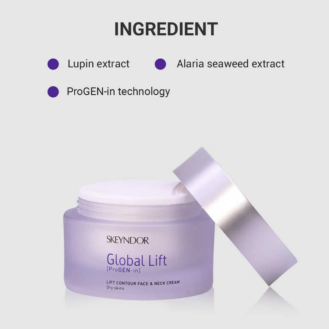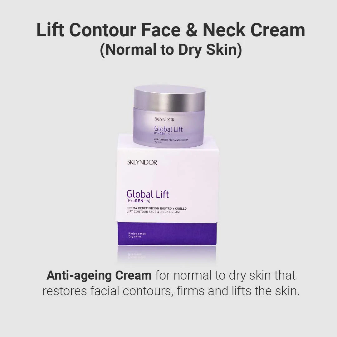 Indulge your skin in the luxurious care of Skeyndor Lift Contour Face and Neck Cream, specifically formulated for normal to dry skin. This advanced anti-age cosmetic harnesses the power of cutting-edge [ProGEN-in] Skeyndor technology, along with potent ingredients like Alaria seaweed extract and Lupin extract. The cream is meticulously crafted to combat the signs of aging, delivering a transformative firming effect that redefines facial contours and restores fullness to the skin.