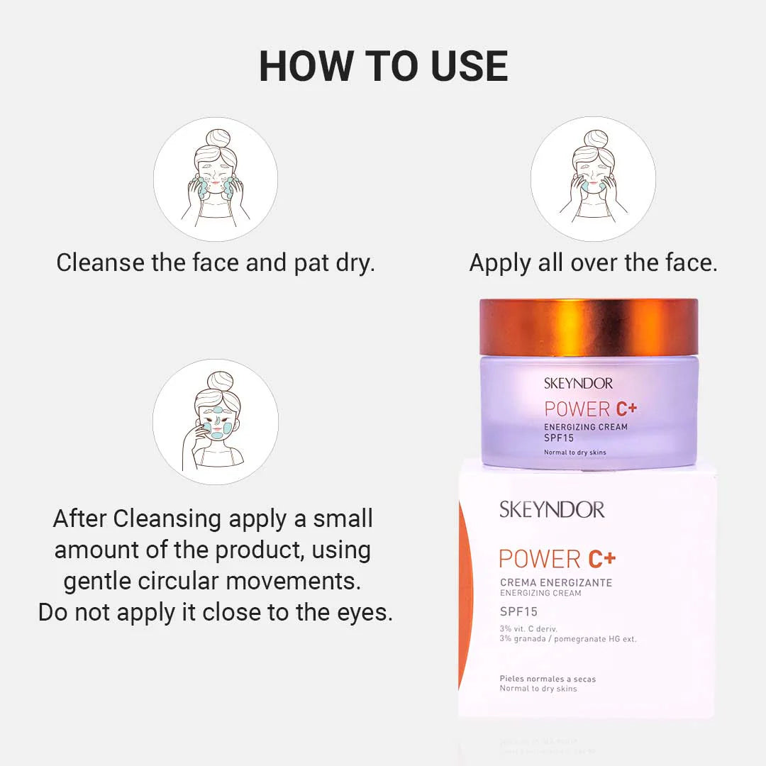 Apply the Power C Energizing Cream SPF 15 to cleansed and toned skin. Massage gently using upward motions until fully absorbed. Use in the morning as the final step of your skincare routine. For enhanced protection, reapply every 2 hours when exposed to direct sunlight. Avoid contact with eyes. If irritation occurs, discontinue use.